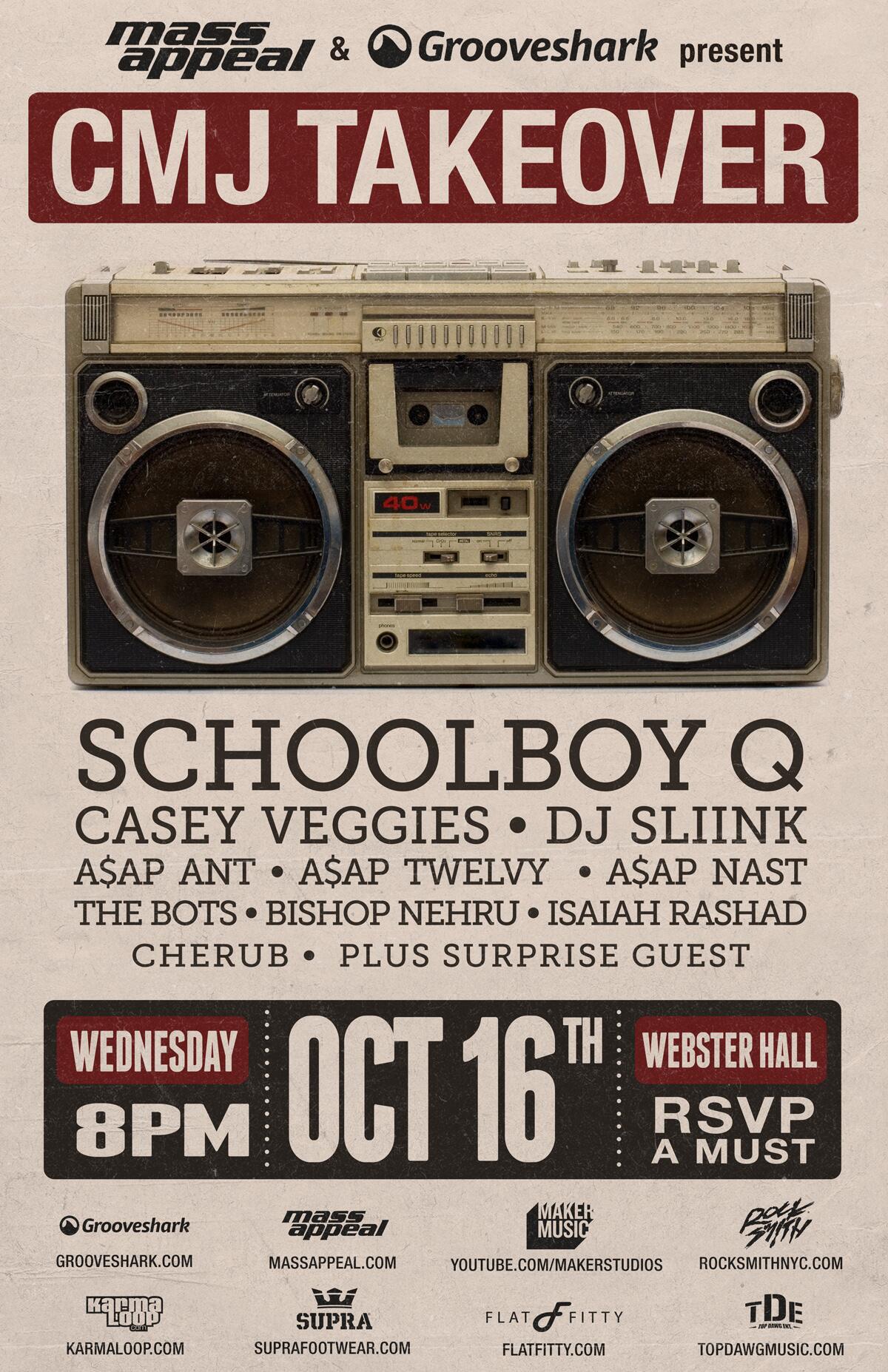 (Mass Appeal) & (Grooveshark) present "CMJ Takeover" featuring (ScHoolboy Q) (Casey Veggies) (A$AP Ant) (A$AP Twelvy) (A$AP Nast) & more (October 16th) 2013 live at (Webster Hall) (New York City)